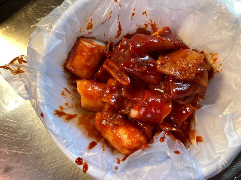 お餅が太くてもっちりしてます!赤い甘辛ダレに、はんぺんみたいなのも入ってます。めっちゃ美味い!